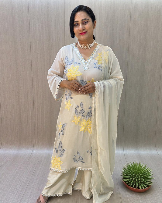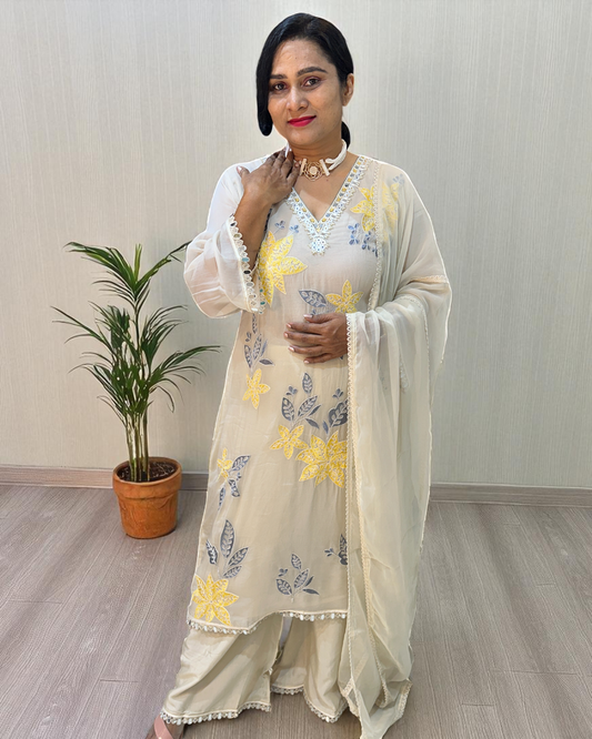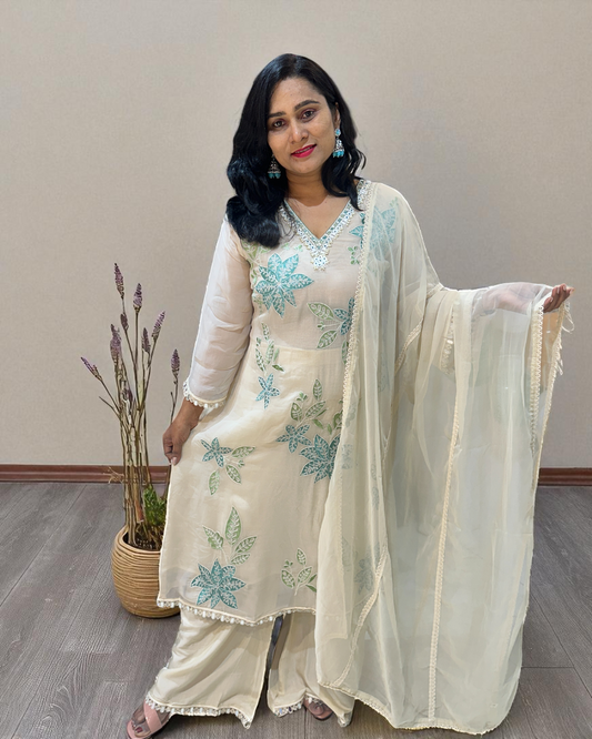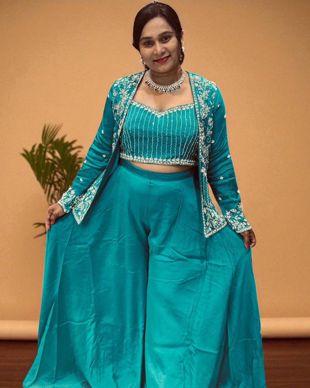 Ferozi Zoya Chinon Silk Handcrafted Crop Top, Jacket Palazzo Set