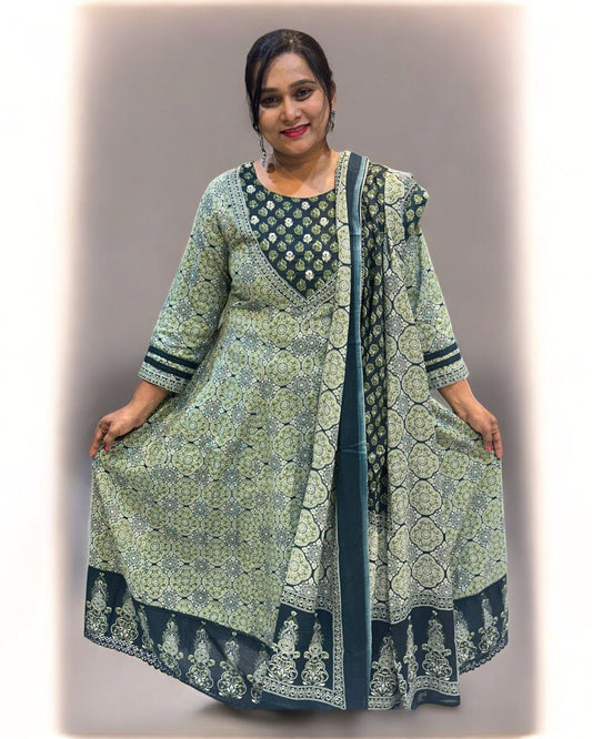 Green Mayura Ajrakh Cotton Anarkali Suit
