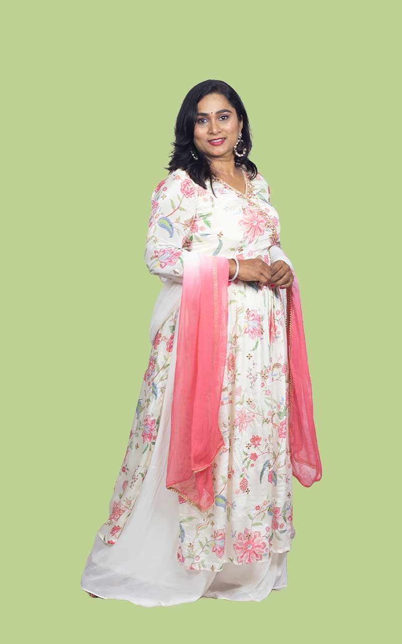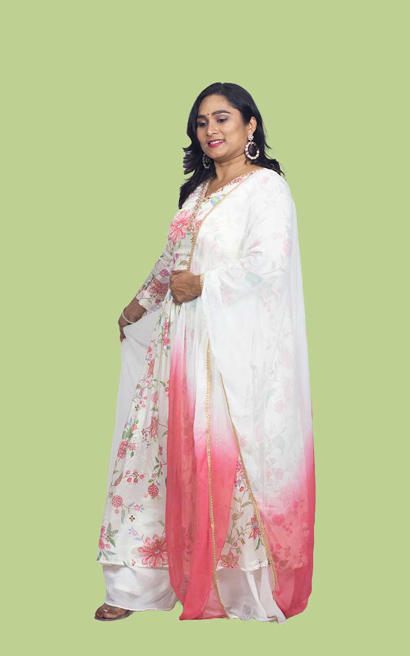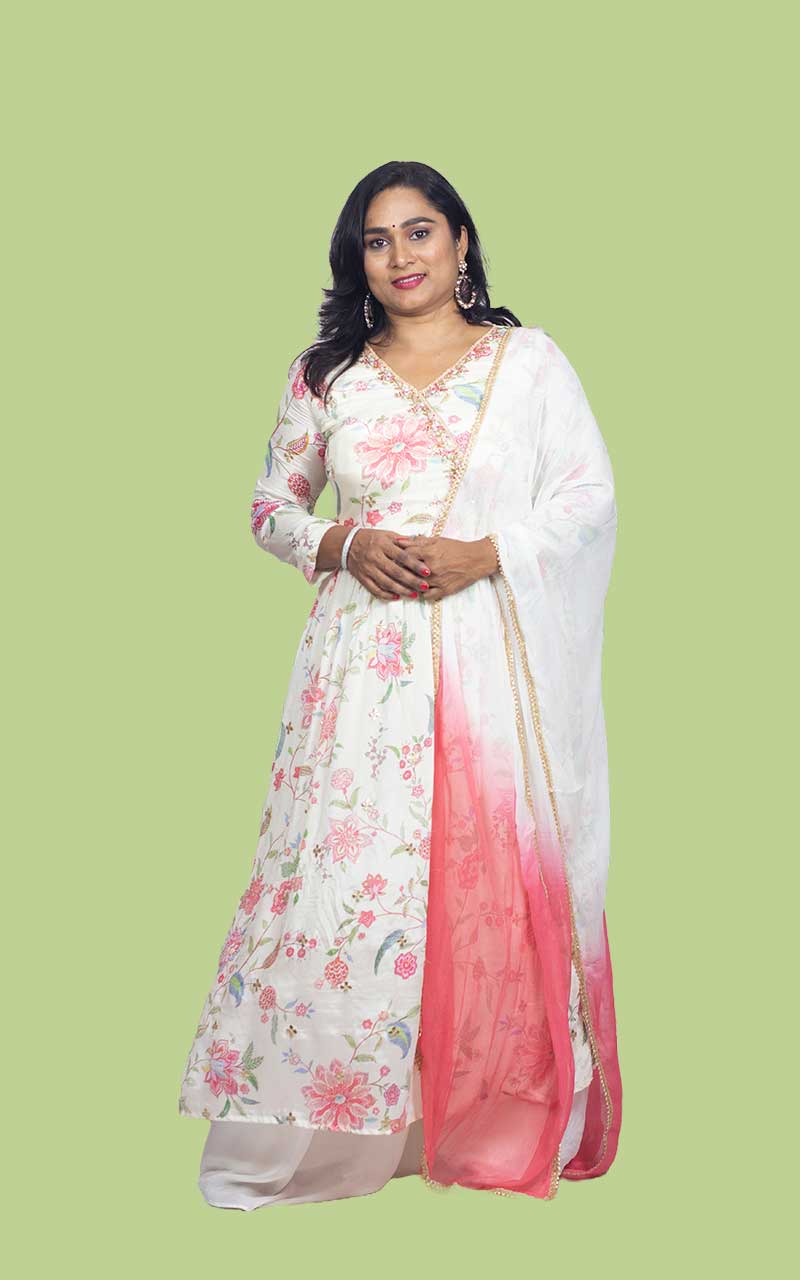 Upgrade your wardrobe with our elegant Offwhite Angrakha Chinon silk set. This floral suit comes with a palazzo and dupatta, providing a complete look. Made with high-quality silk, it is perfect for any formal occasion. Exude sophistication and style with this must-have set.