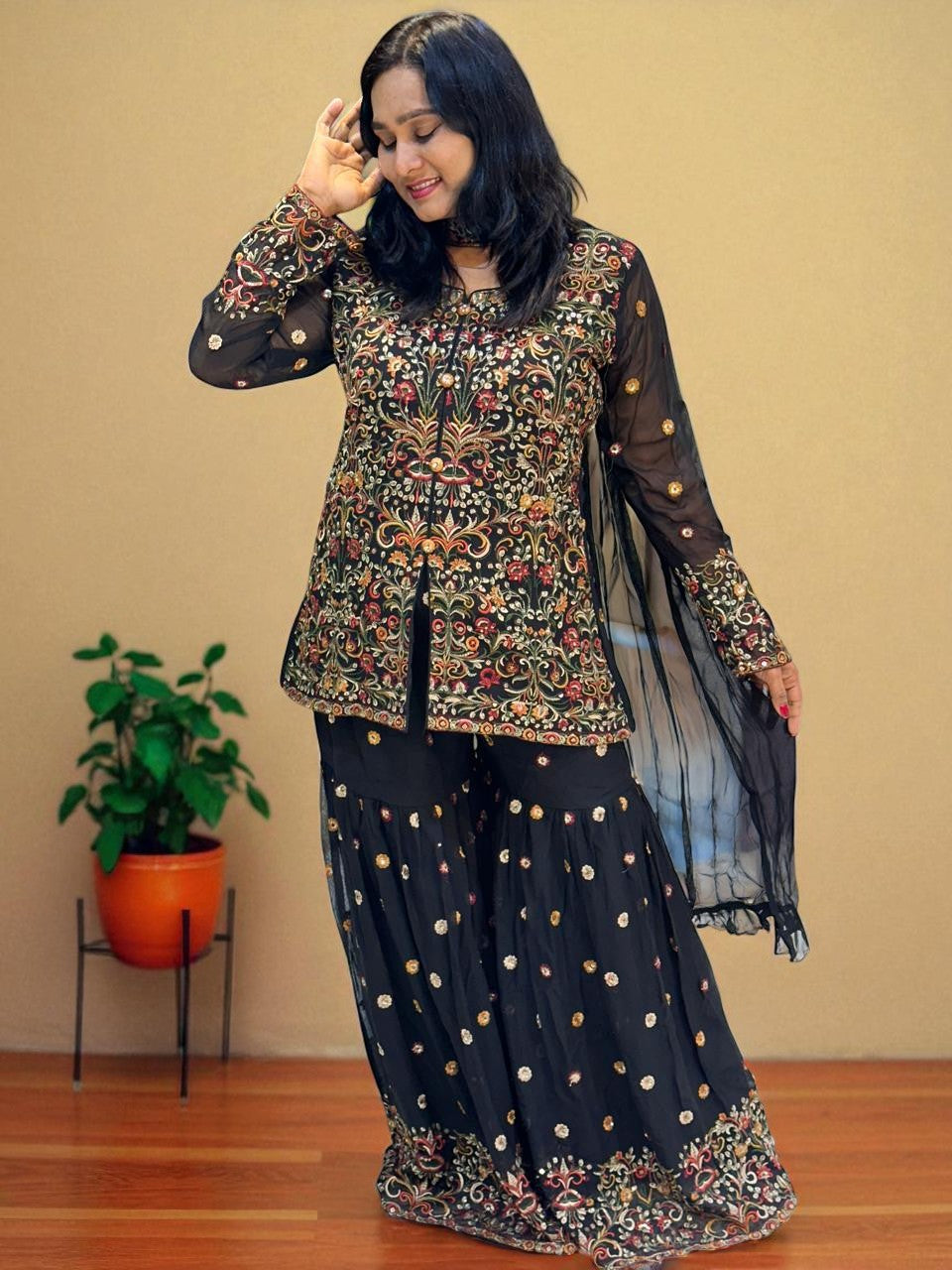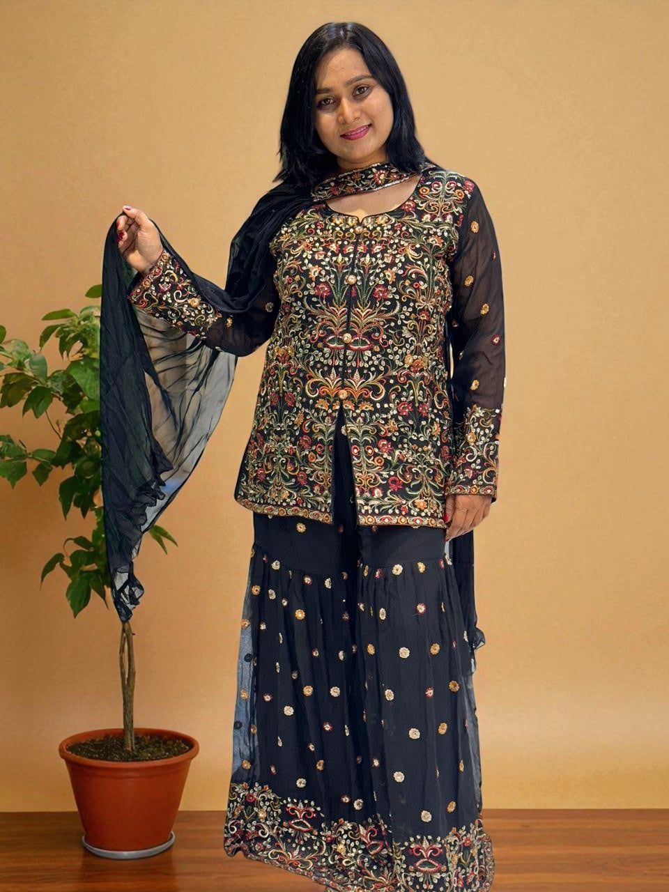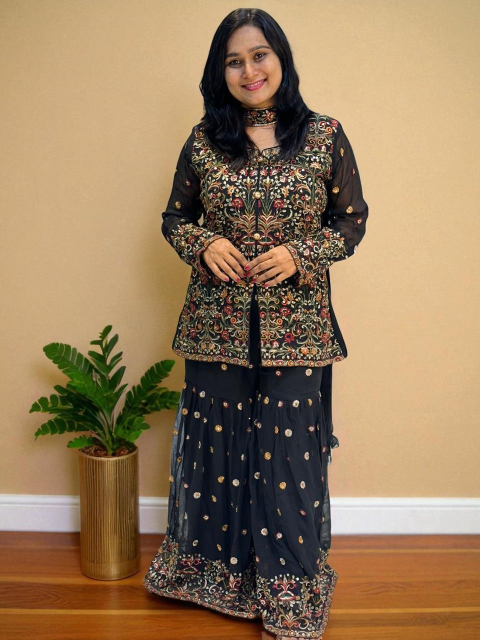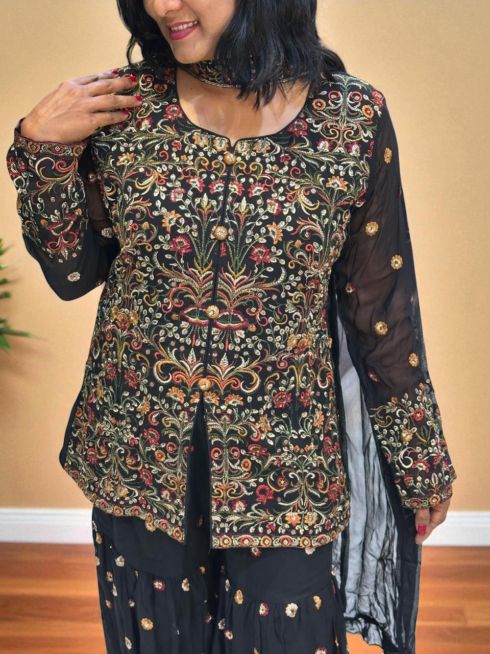 Black Kashmiri Georgette Embroidery sharara Indowestern set