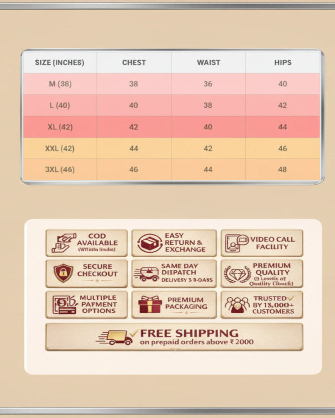 Refund Policy : At Shrilooms, we prioritise your satisfaction. If you're not fully pleased with your purchase or you received a damaged or wrong product, you may return it within 3 days of receiving the parcel, we'll arrange a return pickup. Ensure that items are unworn, unwashed, and in their original condition with tags intact. If you want to change the product and wish to return it, the pickup charges will be the responsibility of the customer. Return will be issued to the original payment method. For exchanges, contact our customer service team. We value your trust and are committed to assisting you every step of the way.