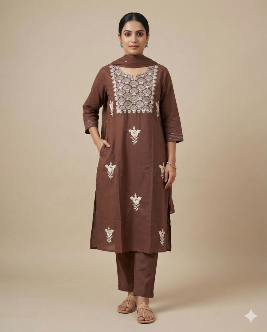 Brown Rishika Cotton Suit set - Set of 3 Crafted from premium cotton, this three-piece suit set delivers versatility for both professional and casual settings. The Brown Rishika collection features a refined cut that transitions seamlessly from office wear to weekend styling. Each piece is designed with quality construction and breathable fabric, ensuring comfort throughout the day. Perfect for those seeking a reliable wardrobe staple that balances sophistication with everyday wearability.