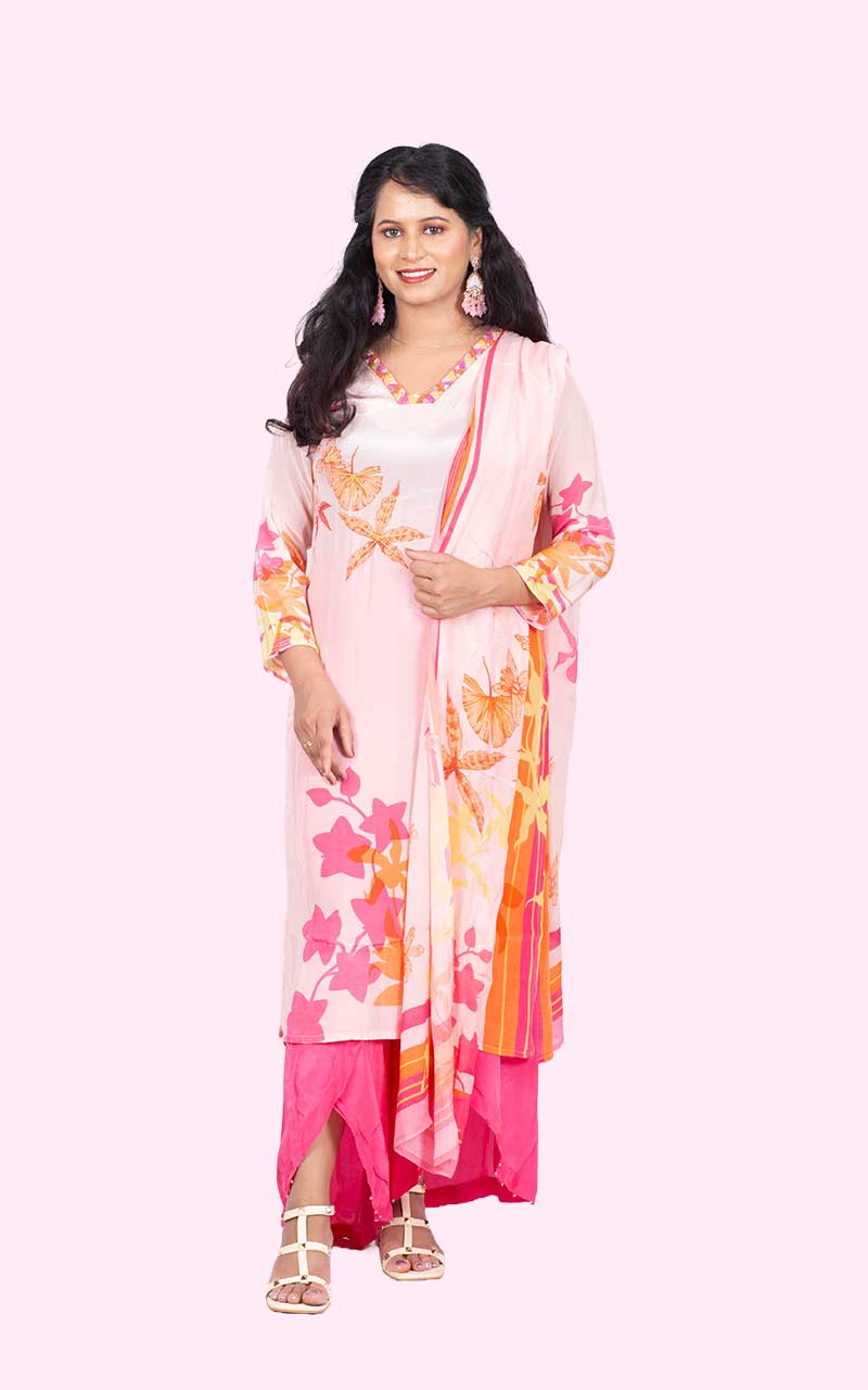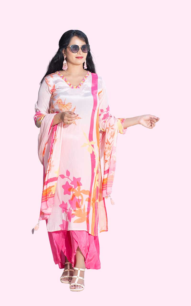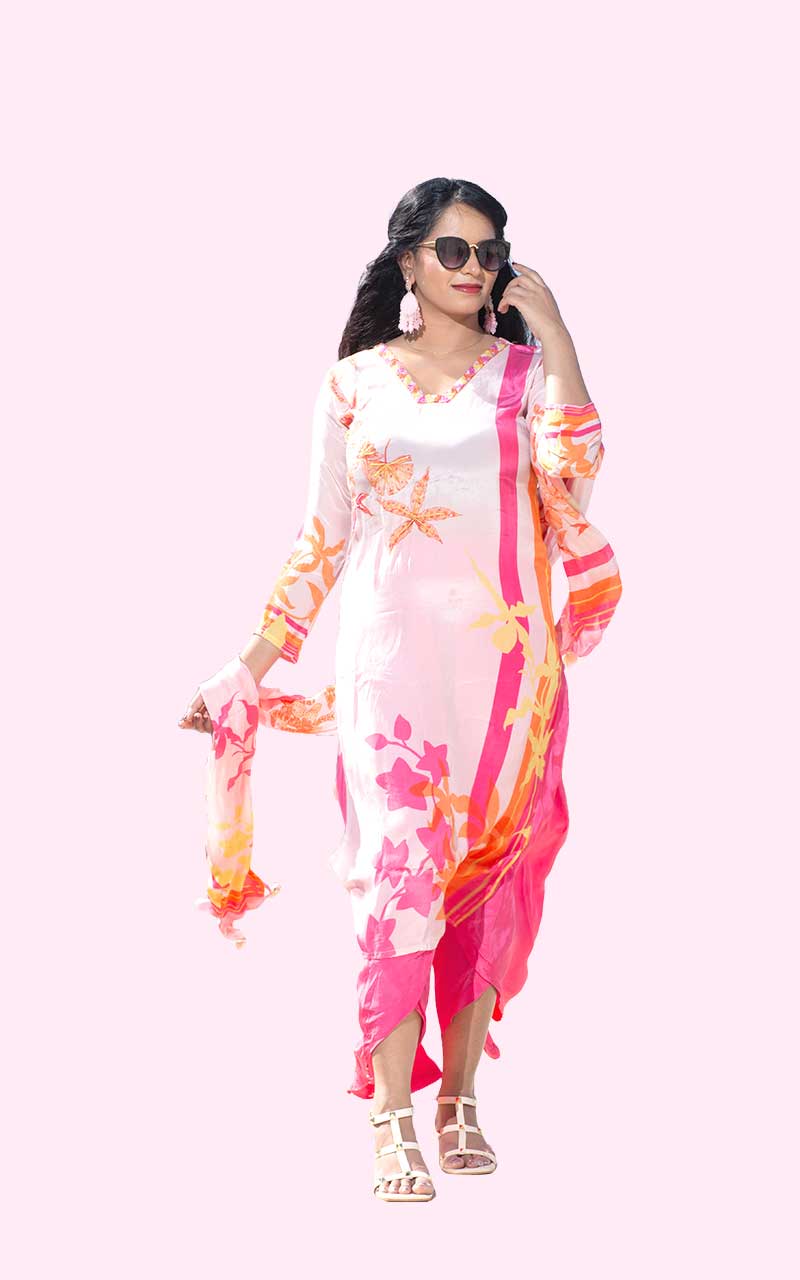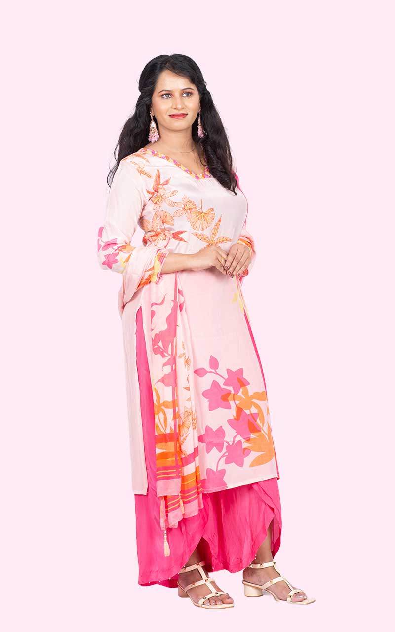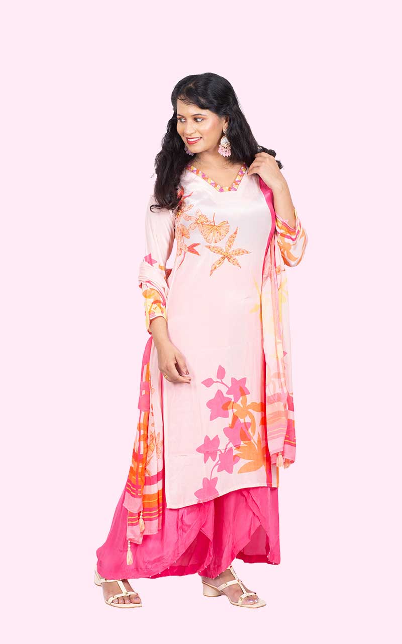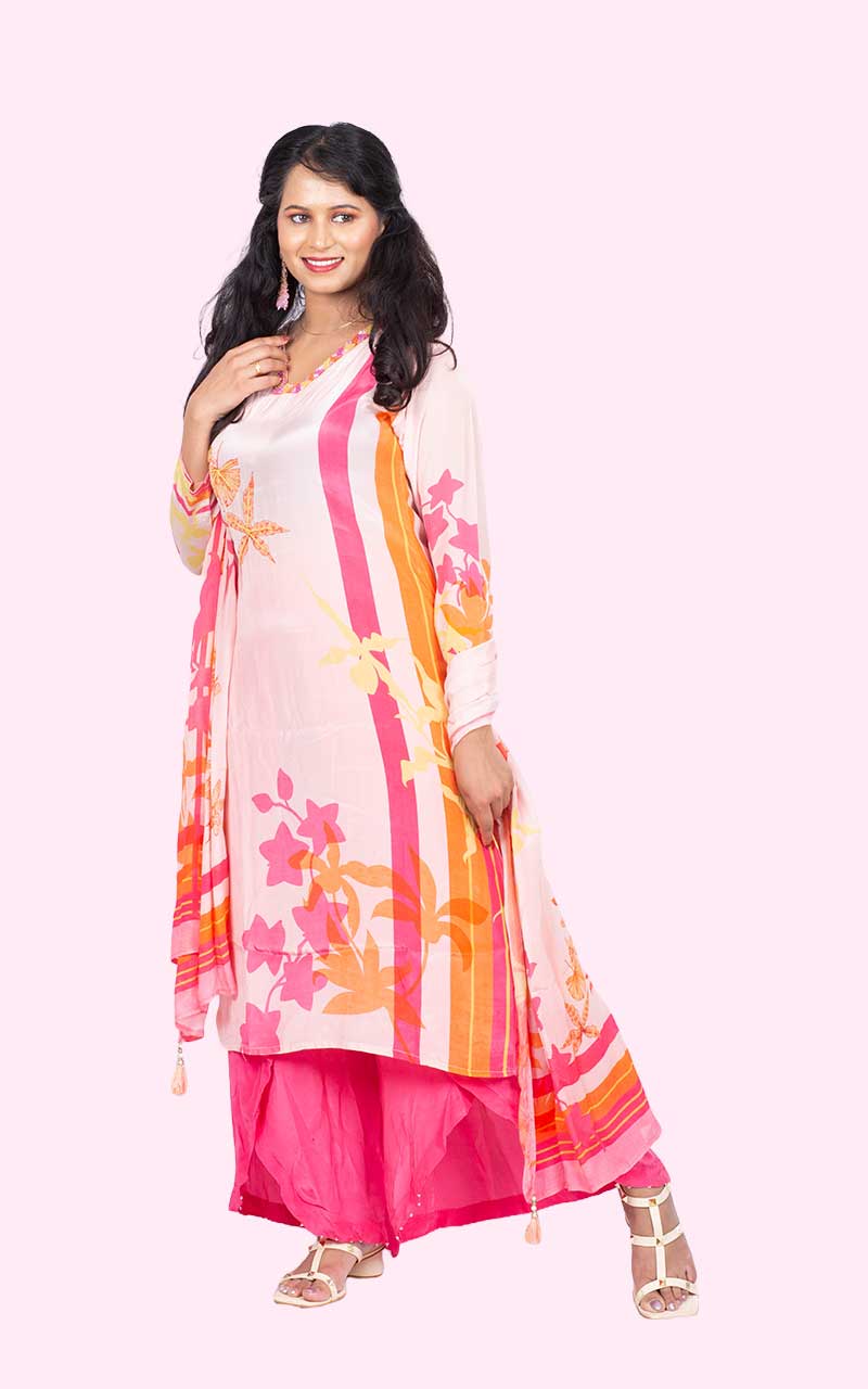 Make a chic statement in this crepe silk suit set, featuring a beautifully printed design and a unique designer bottom for a contemporary ethnic look.