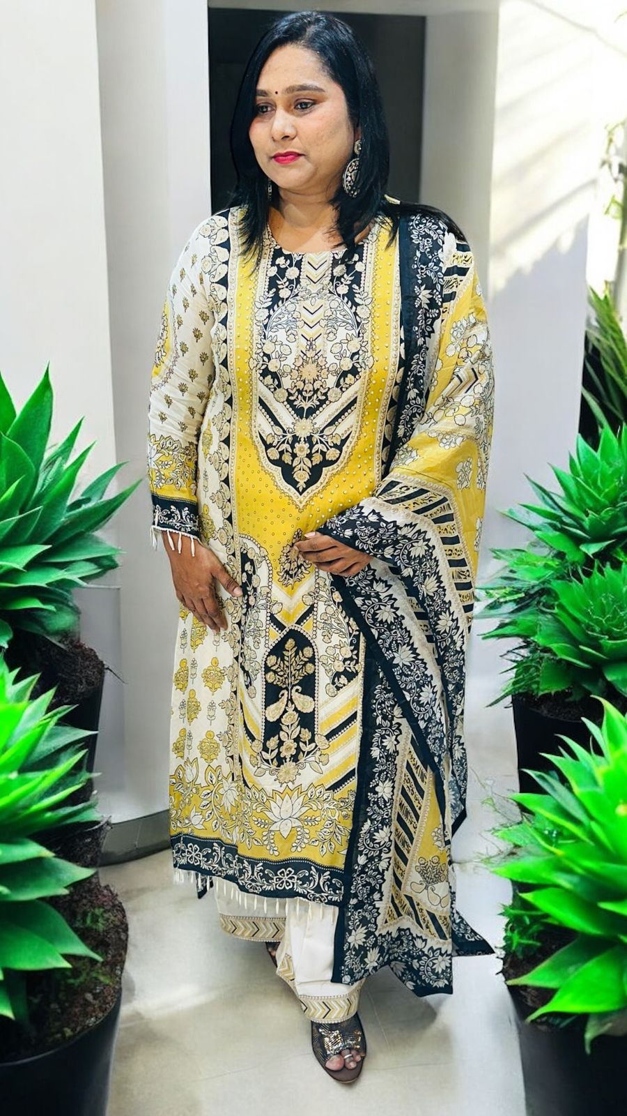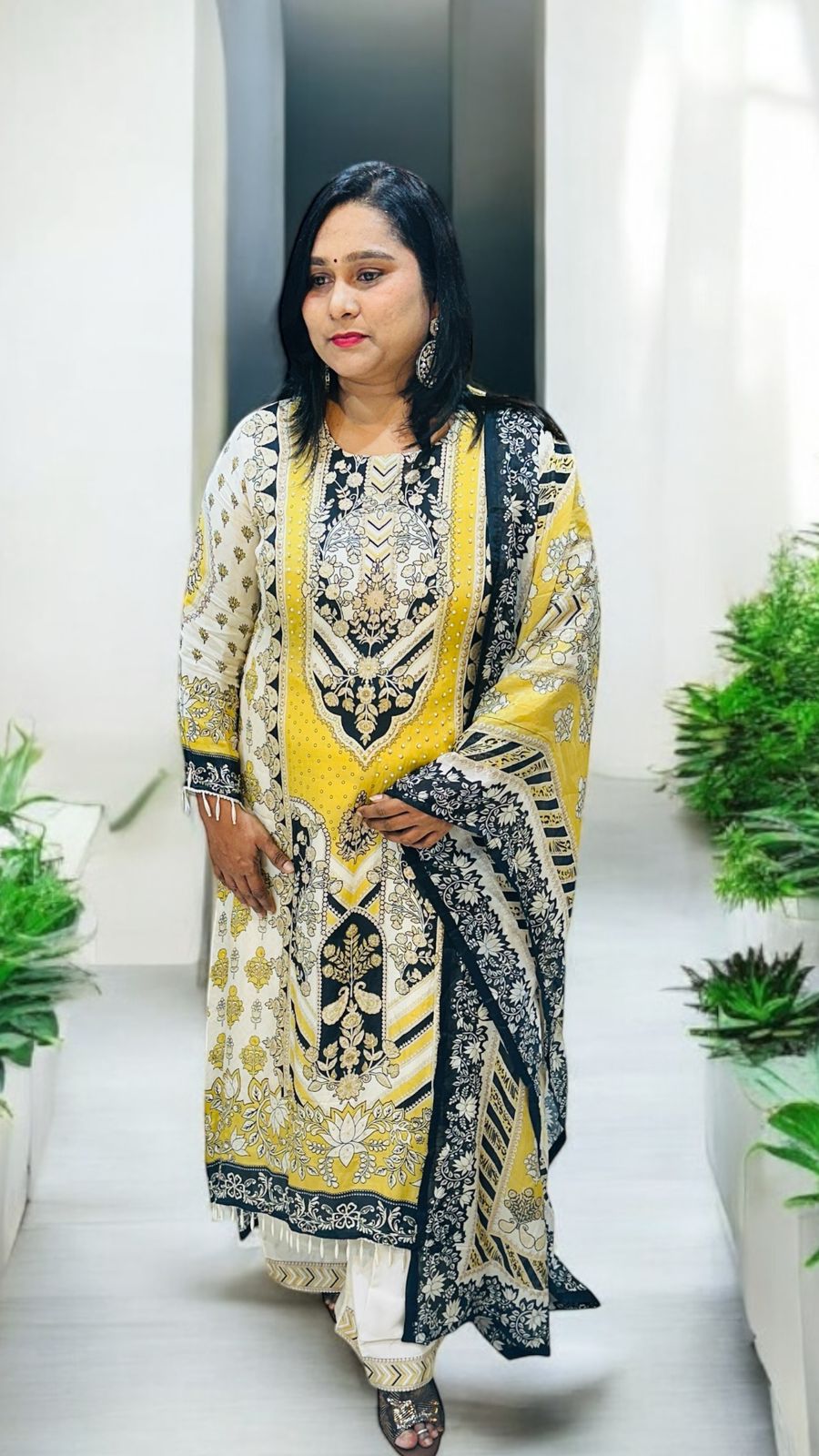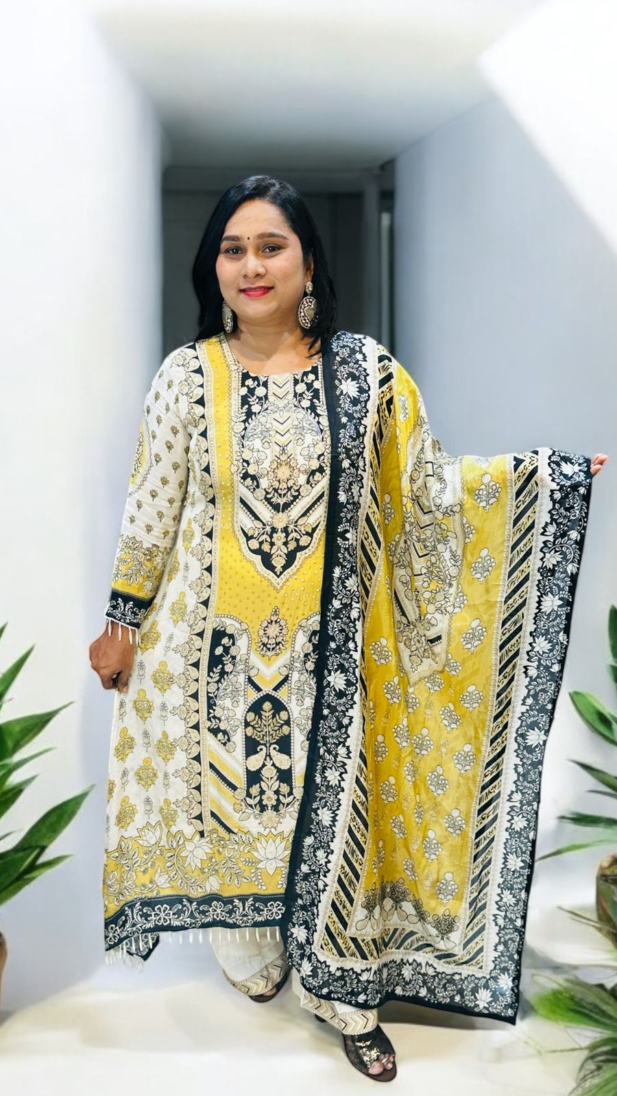 Elevate your wardrobe with IQRA, an exquisite suit crafted from luxurious pure crepe silk. This elegant ensemble features intricate patterns in hues of yellow, black, and white, bringing a sophisticated charm to your ethnic attire.