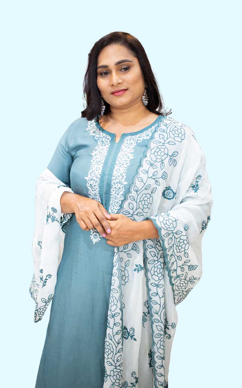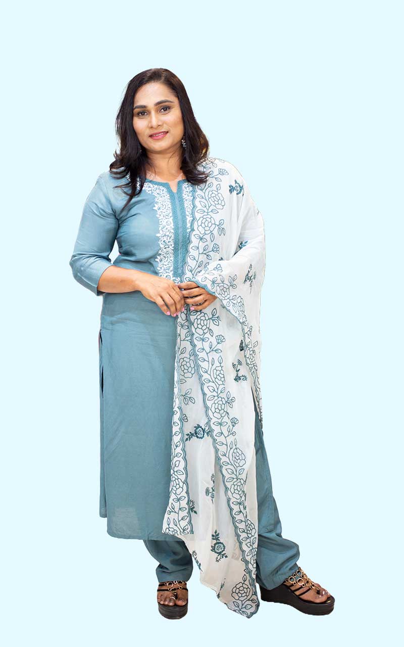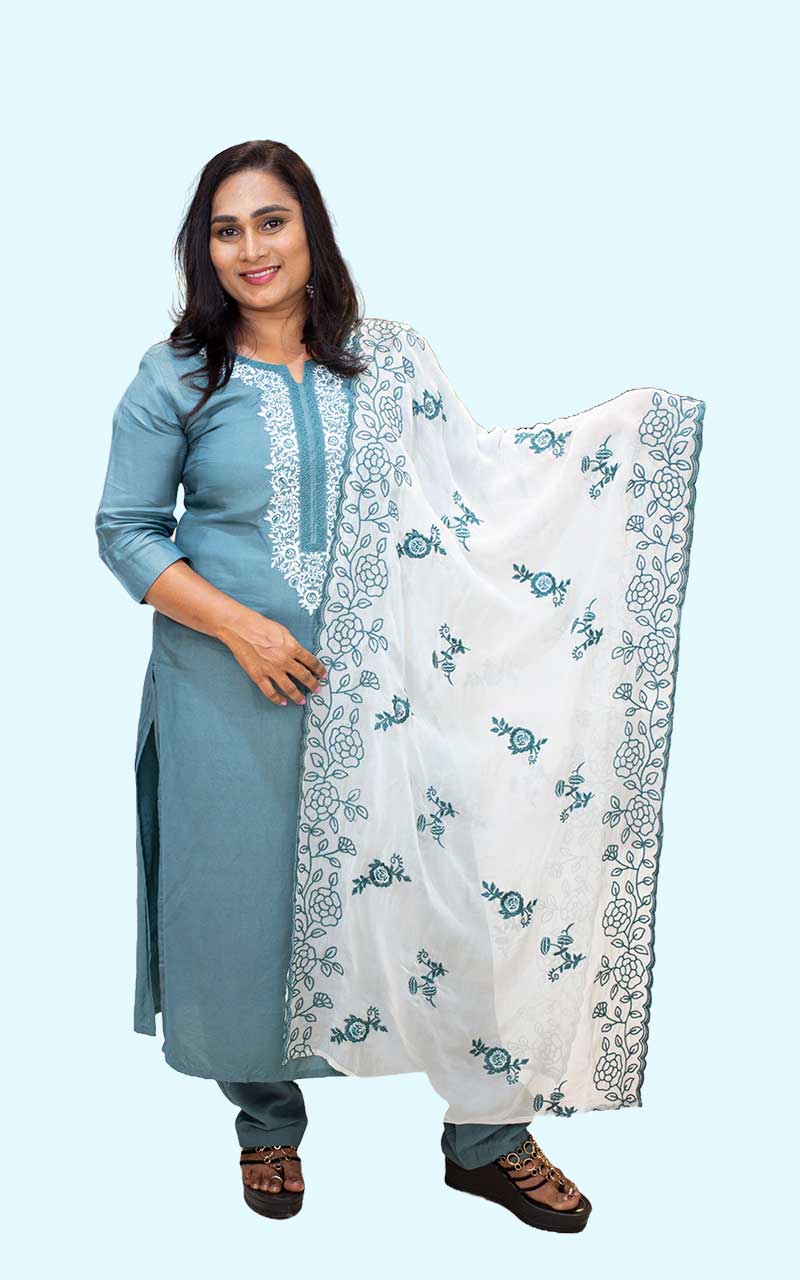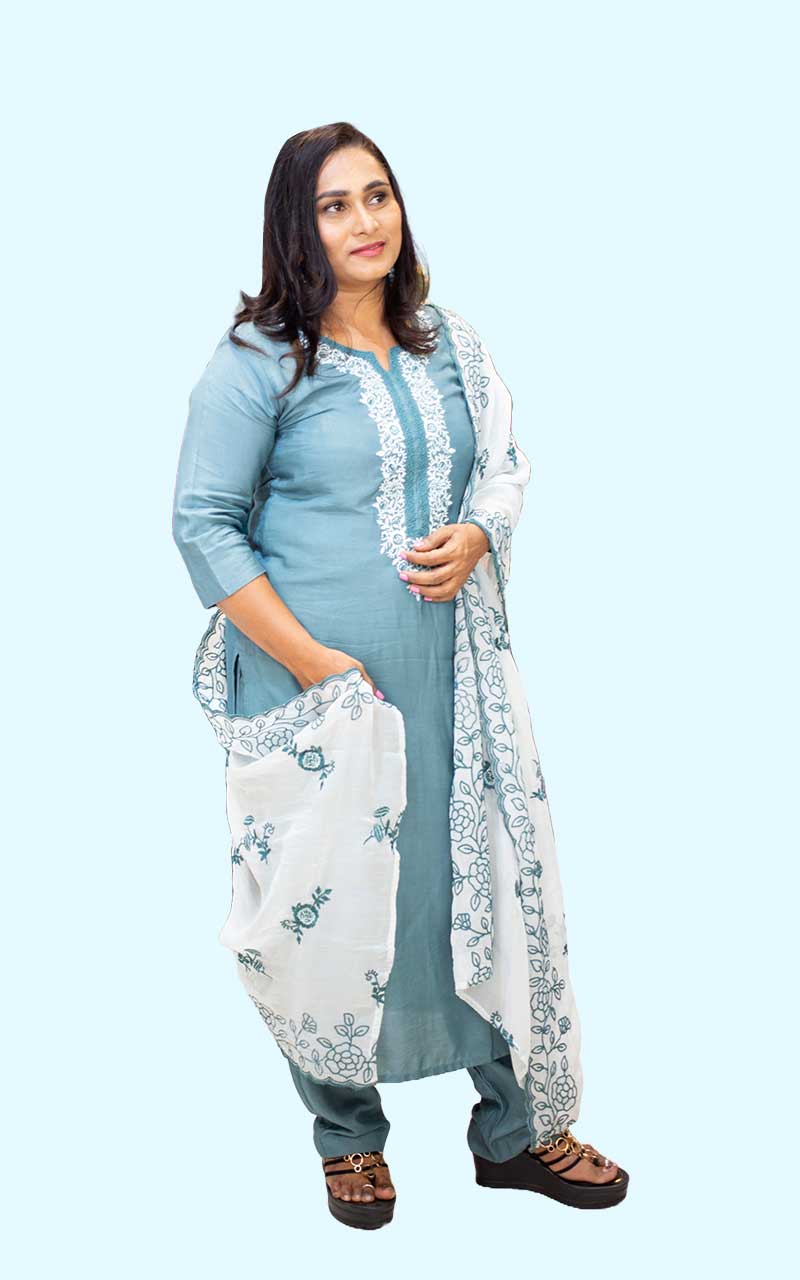 This Powder blue Muslin Suit Set is made from soft and breathable muslin fabric, designed with scalloped embroidery for a sophisticated touch. The perfect outfit for any special occasion, providing both comfort and style.