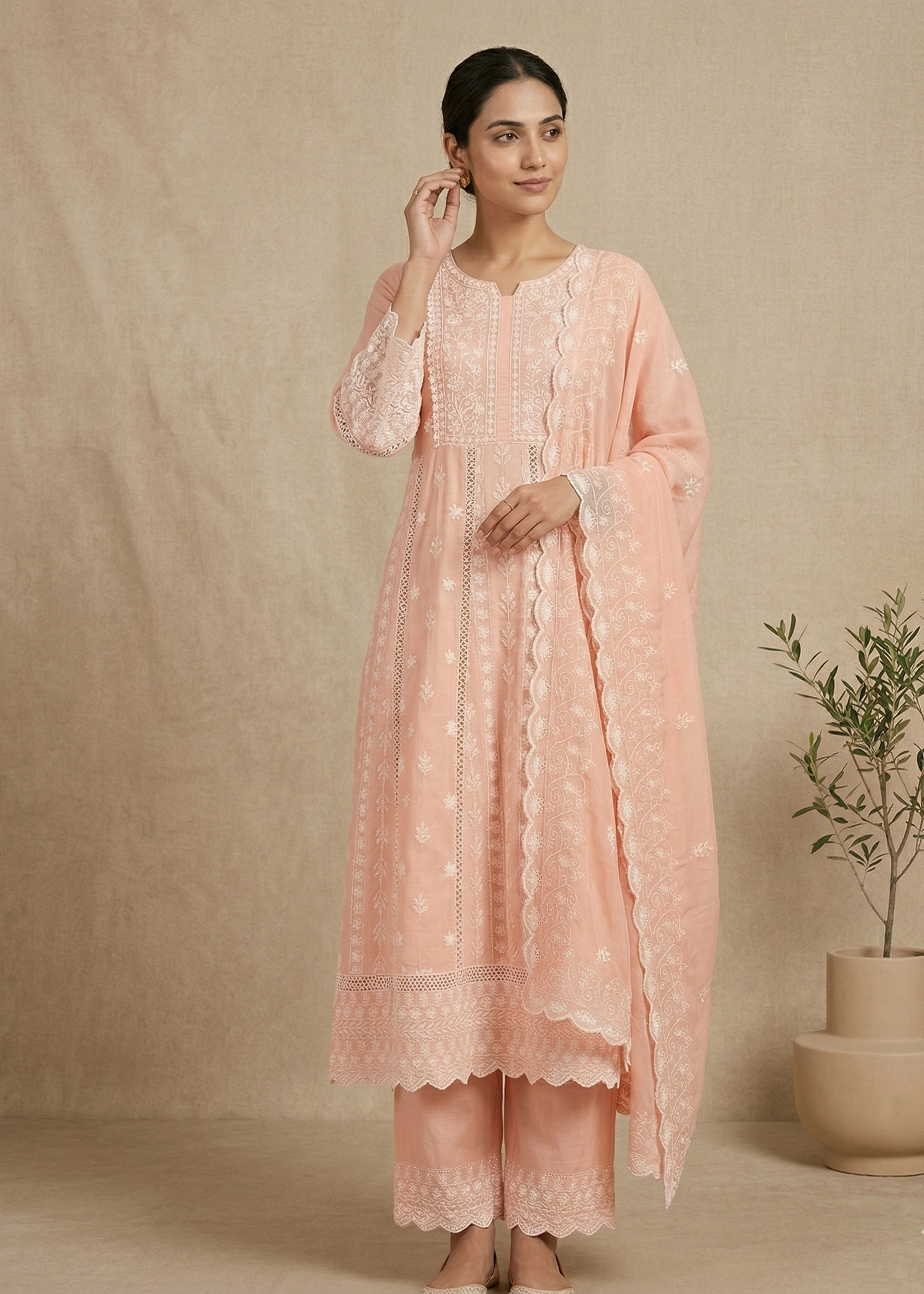 Mysha Mul Cotton Peach Chikankari Anarkali Suit Set