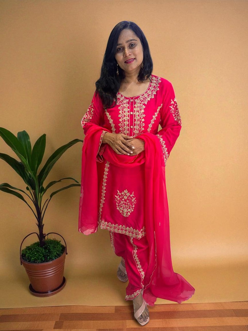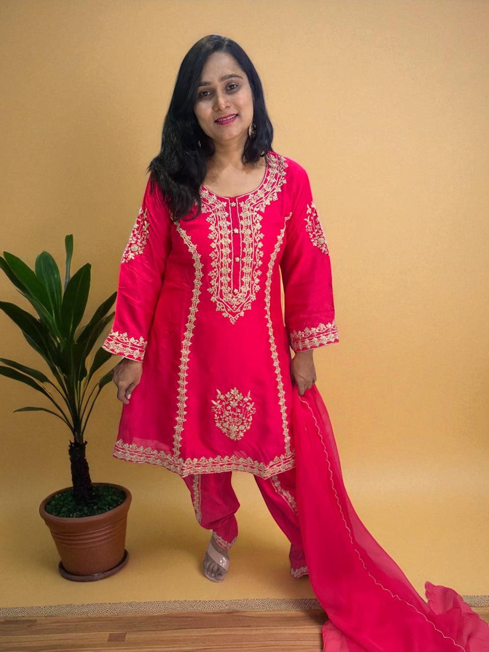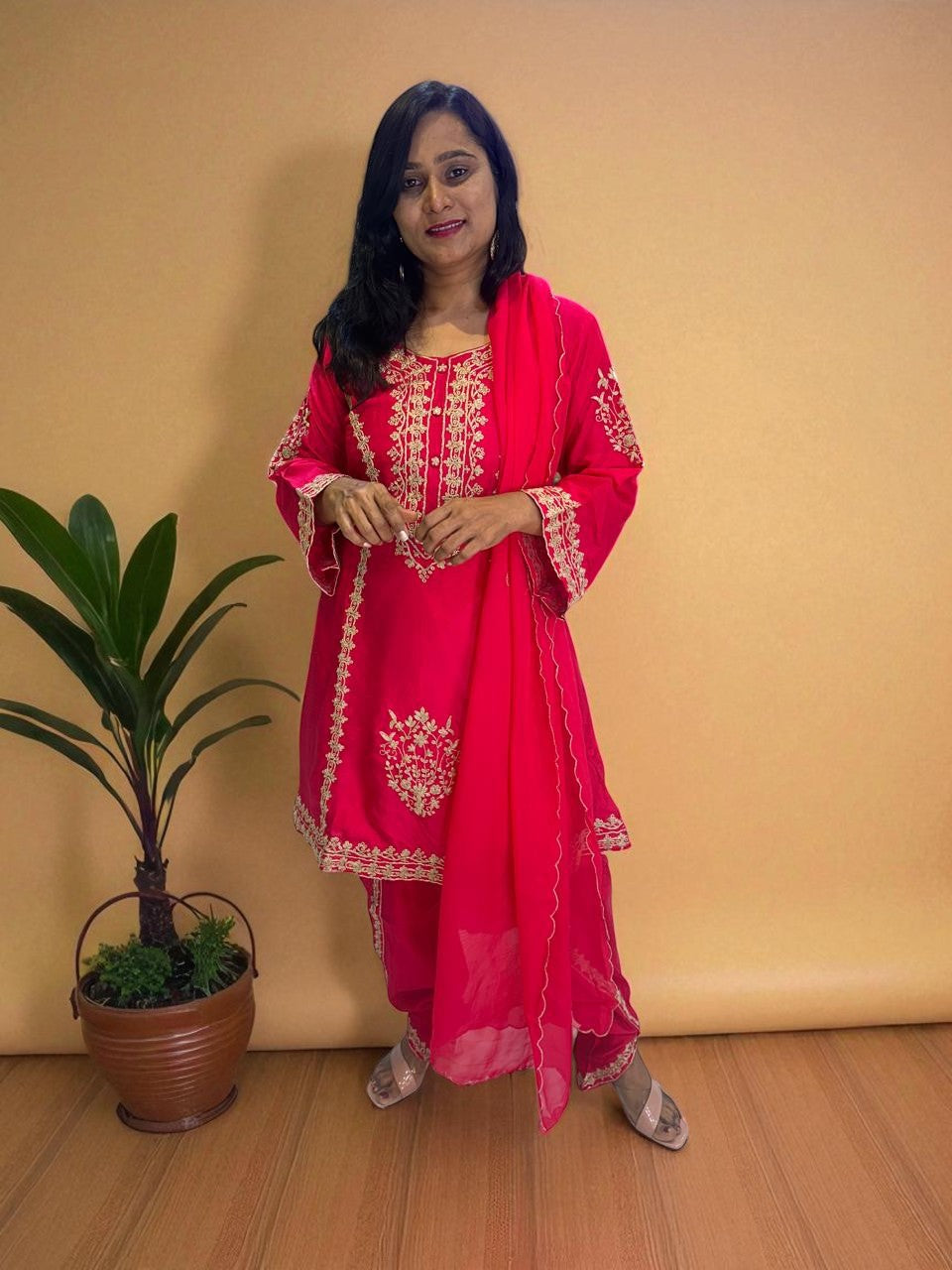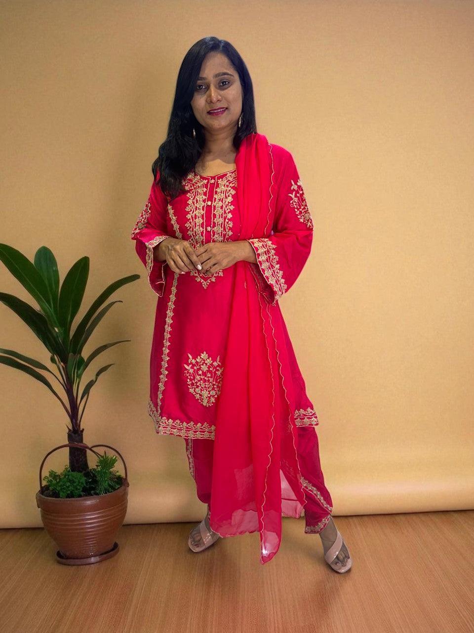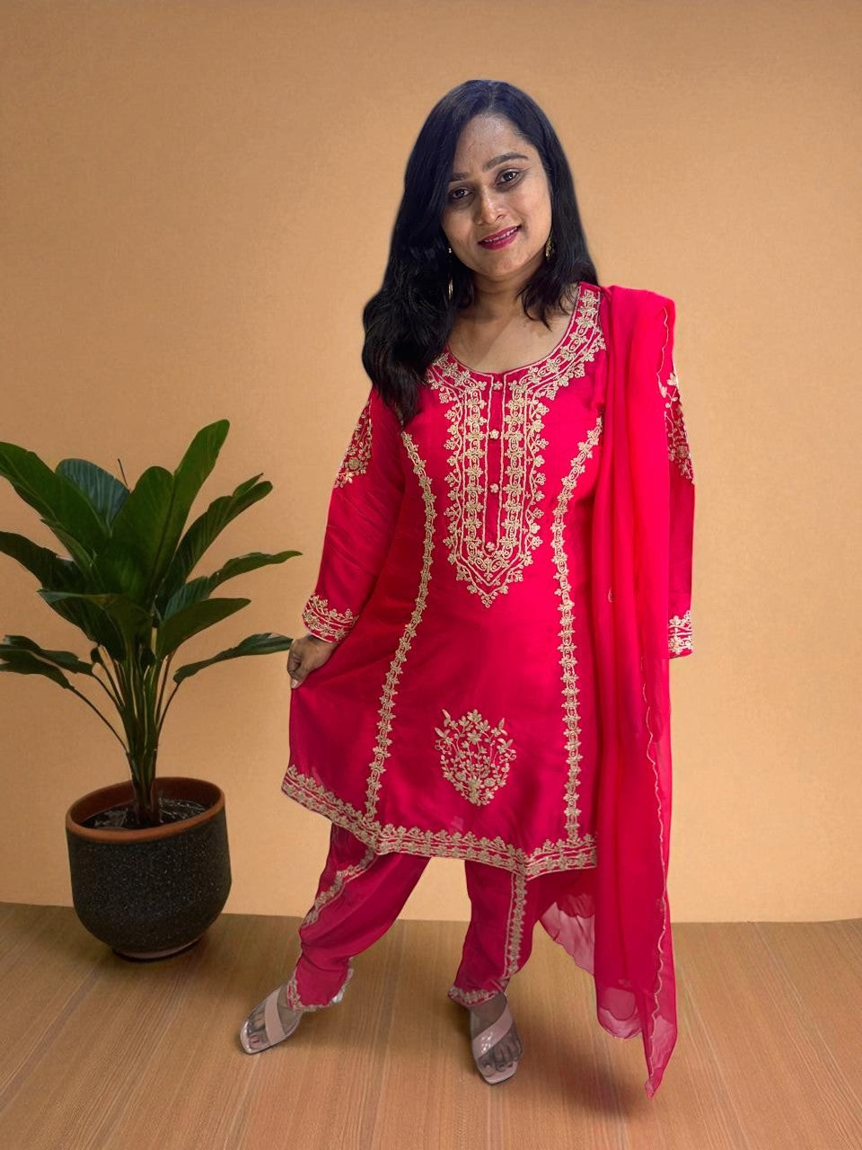This Pink Dola silk A-line Dhoti Bottom suit set combines traditional elegance with contemporary style. Crafted from rich Dola silk, the suit features an A-line silhouette paired with comfortable dhoti-style bottoms, making it perfect for festive and cultural occasions. Its breathable fabric and graceful drape ensure both comfort and sophistication, ideal for those seeking a refined ethnic look.