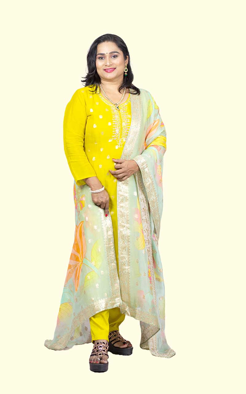 Elevate your traditional look with our Yellow Organza Banarasi Suit Set. Made with vibrant yellow organza, this set is perfect for haldi ceremonies and other festivities. Its intricate banarasi detailing adds a touch of elegance to your outfit. Make a statement and stand out from the crowd with our suit set.